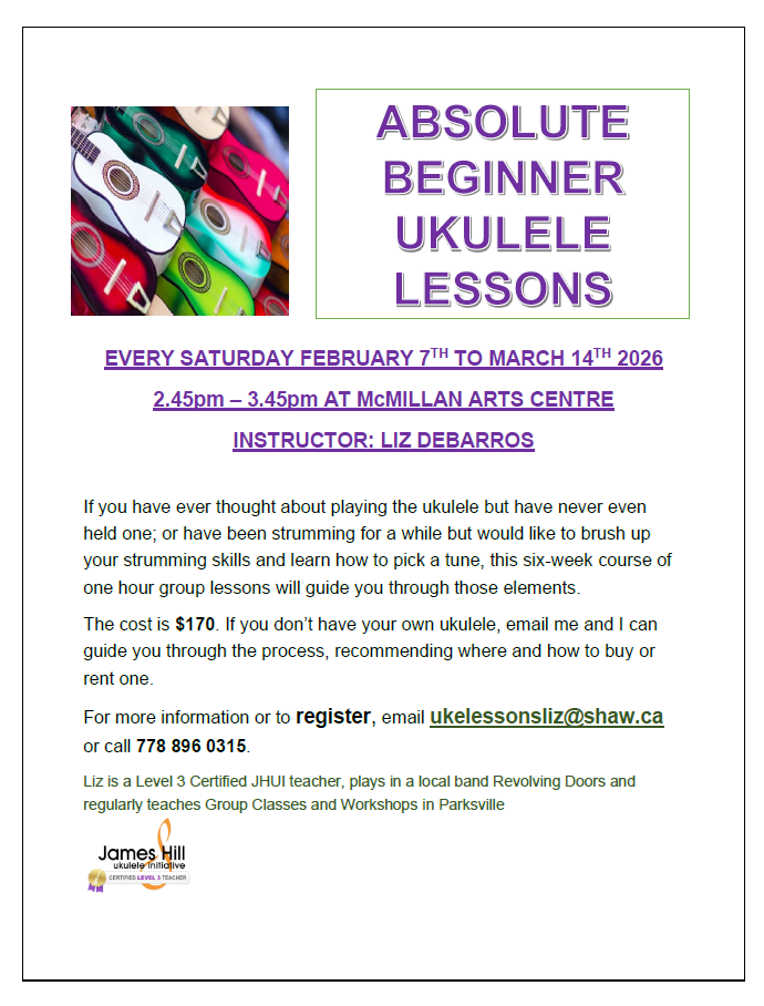 Held every other Thursday night 6:30 - 7:30 pm at the McMillan Arts Centre located at 133 McMillan Street, Parksville, BC. No Drop-In fee.